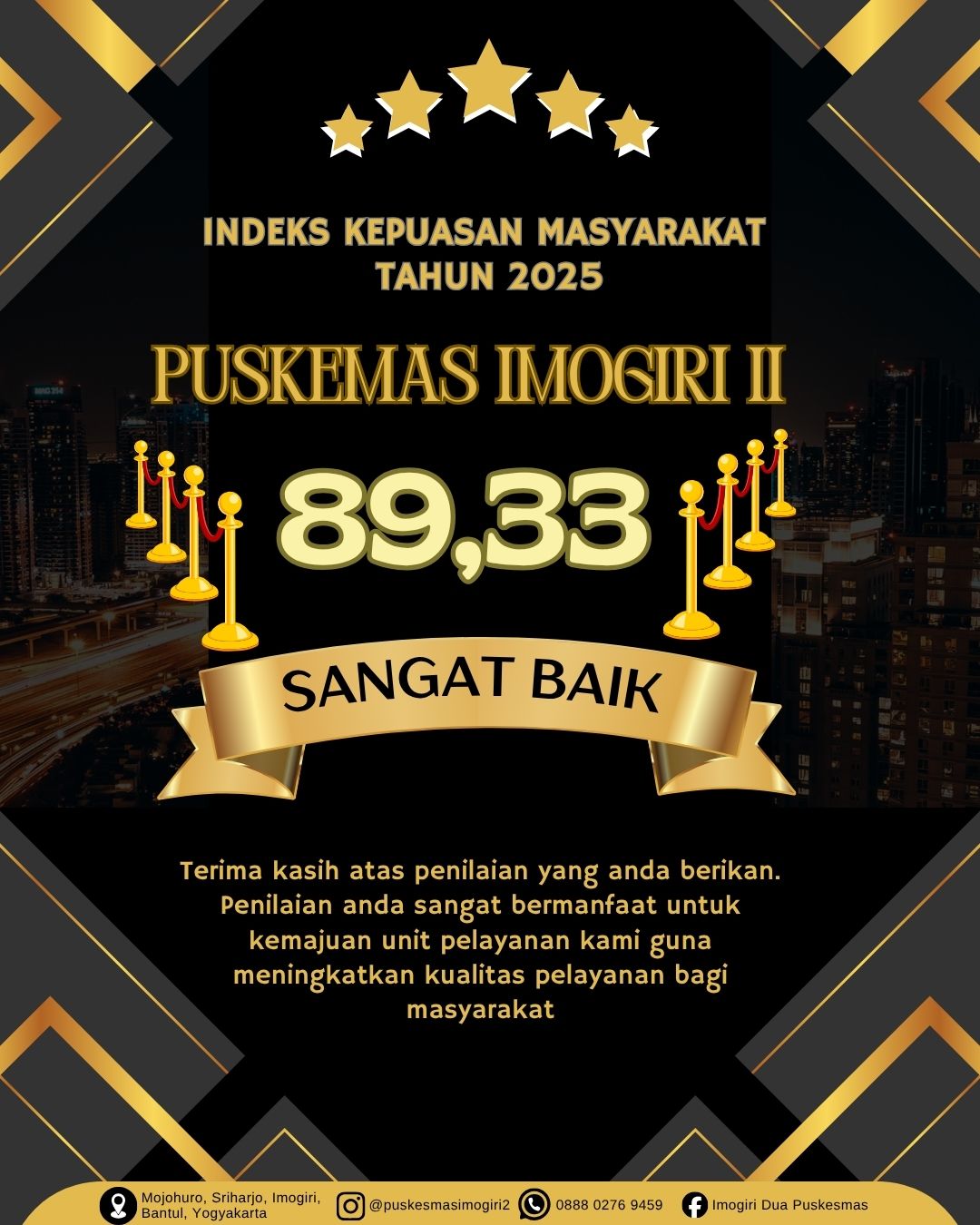 Pada tahun 2025 Puskesmas Imogiri II melaksanakan Survei Kepuasan Masyarakat semester 1 pada bulan Januari sampai dengan bulan Juni 2025 dengan hasil perolehan nilai SKM sebesar 89,33 % dengan kategori sangat baik. Namun Puskesmas Imogiri II akan tetap berupaya memberikan pelayanan yang lebih baik demi tercapainya pelayanan prima untuk masyarakat.